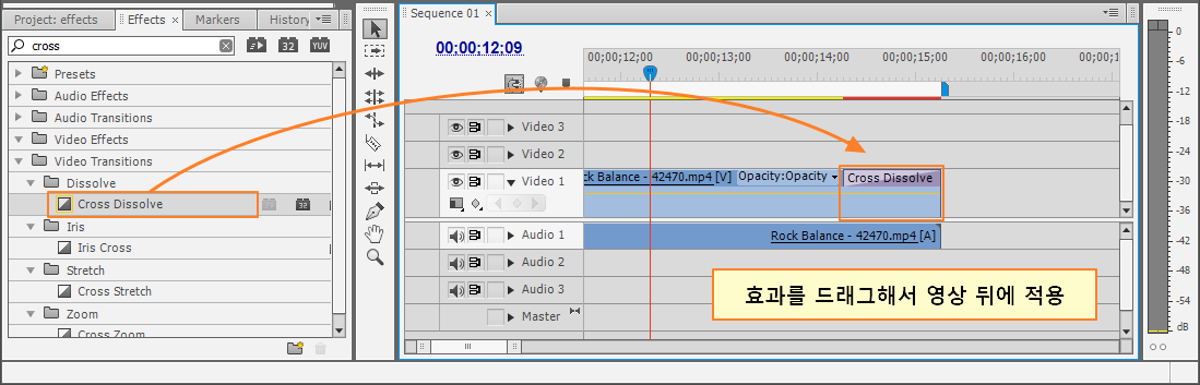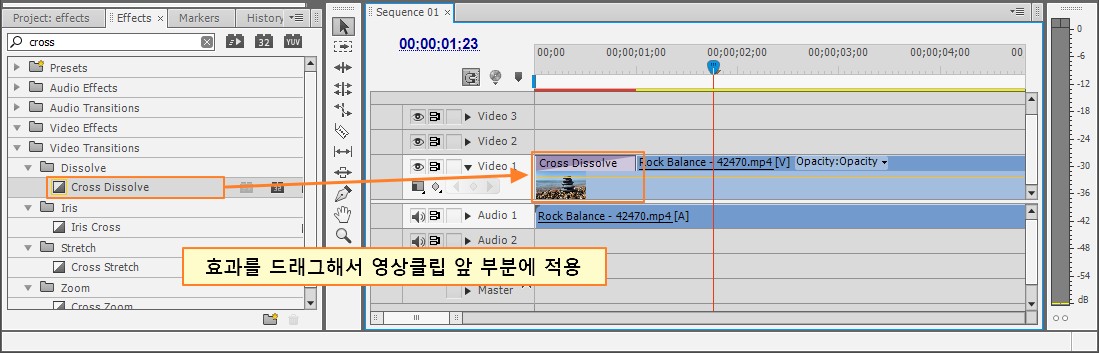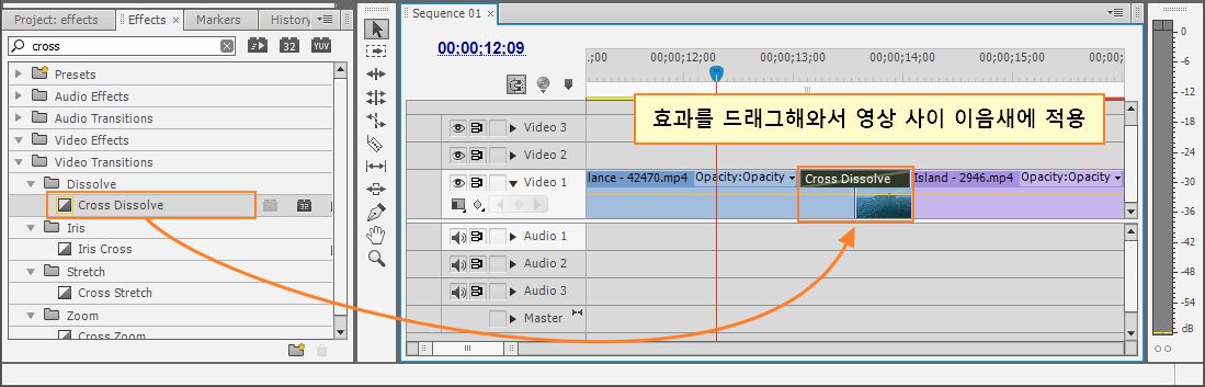 방법.1 : 트랜지션 효과와 같이 효과를 드래그해서 영상 클립에 적용