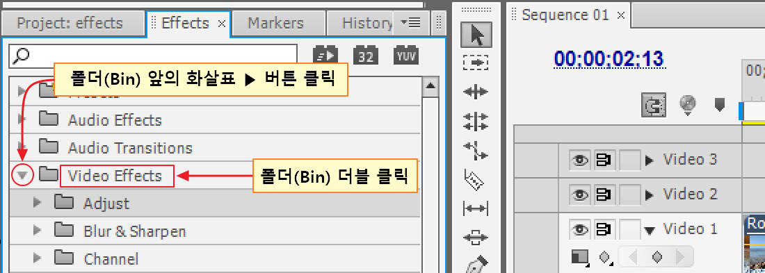 Effects 보관함(Bin/폴더) 열고 닫기