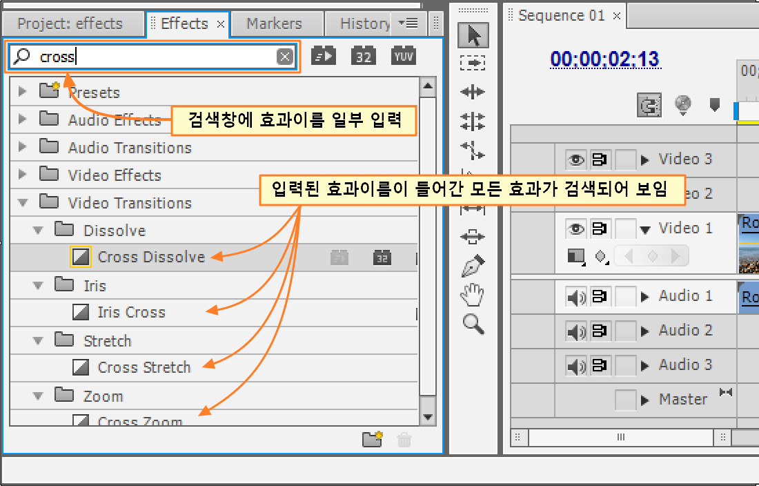 패널 위 검색창에 효과이름 일부를 입력하면 그 이름이 들어간 모든 효과들이 검색되어 나타나게 됩니다.