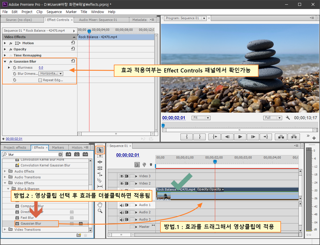 적용한 효과는 Effect Controls 패널에서 확인할 수 있으며 효과 설정 및 제어는 모두 Effect Controls 패널에서 할 수 있습니다.