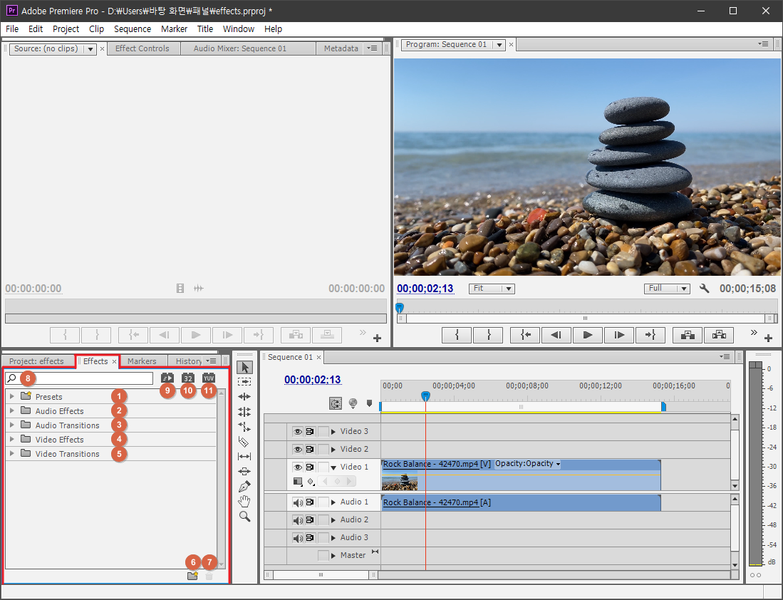 그동안 사용하지 않던 장면 전환 효과, 영상 밝기/색감 조정 등의 효과들을 제공하는 Effects 패널에 대해서 잠시 살펴보도록 하겠습니다.