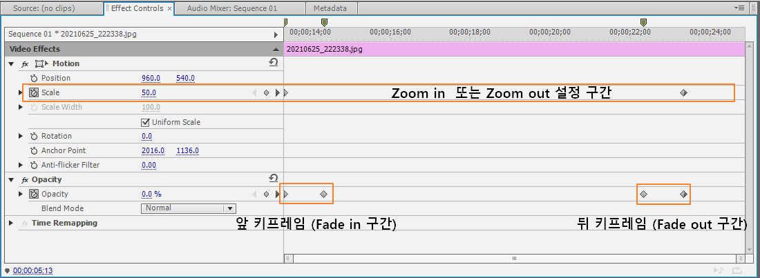 - Fade in/out 구간 : Opacity 항목의 키프레임을 사진의 앞에 1초 간격으로 두 개를 만들고 앞 키프레임 투명도 0%, 사진의 마지막 부분에 두 개의 키프레임을 1초 간격으로 만든 후 마지막 키프레임의 투명도를 0%로 조정