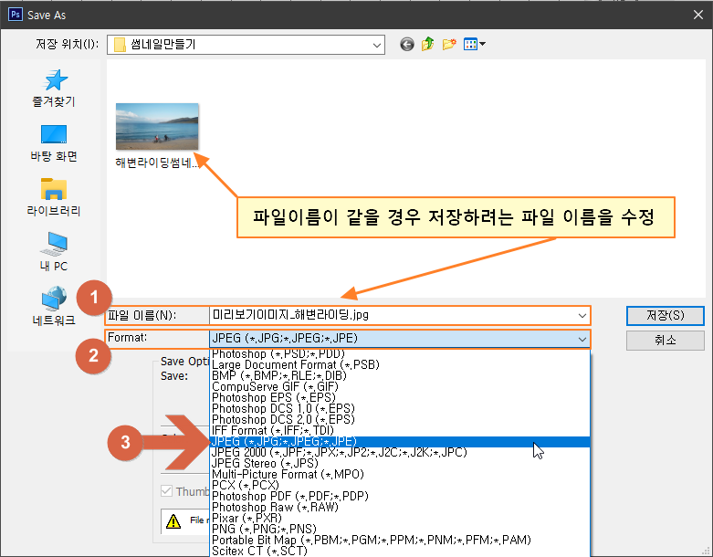 * 프리미어에서 저장해 둔 그림파일을 바로 불러와서 작업하고 저장하면 원본 파일과 이름이 같기 때문에 미리보기 이미지의 파일 이름을 다르게 해서 저장합니다.