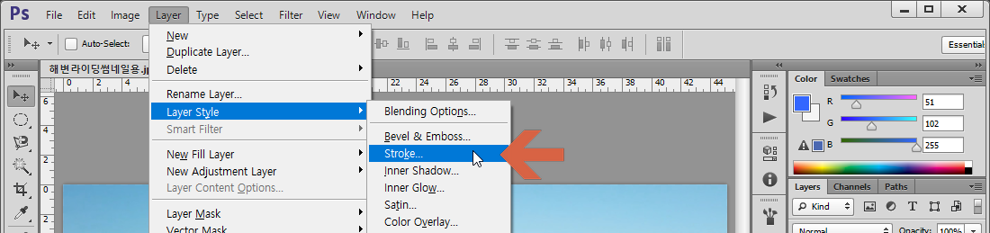 Layer 메뉴 - Layer Style - Stroke 선택