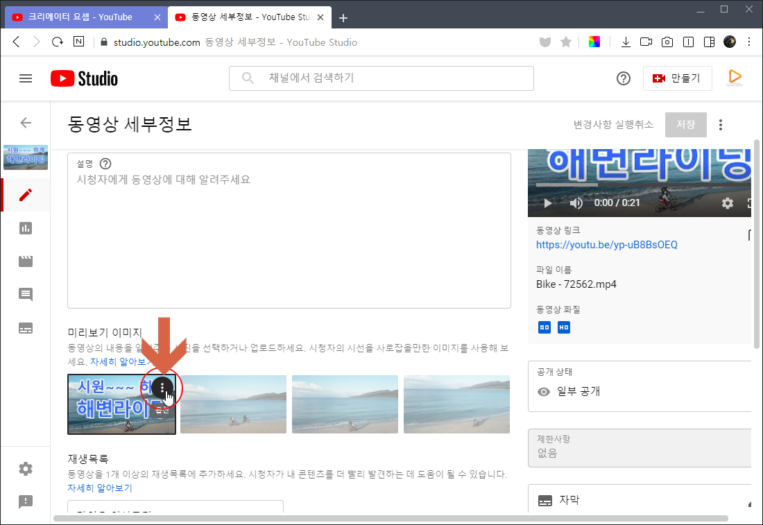 미리보기 이미지는 유튜브에서 기본 제공해 주기도 하지만 영상 등록하는 사람이 별도로 만들어서 등록할 수 있기 때문에 좀 더 눈에 잘 보이도록 꾸며서 등록하게 됩니다.