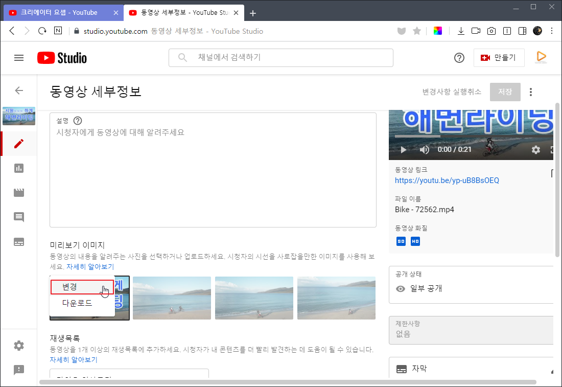 ② 옵션 메뉴에서 [ 변경 ]을 클릭하여 새로 만든 미리보기 이미지를 업로드하면 됩니다.