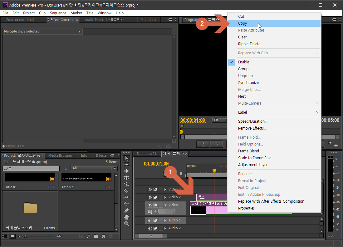 ① 타이틀박스 시퀀스에서 박스와 글자 타이틀 모두 선택 (단축키 Ctrl+A 또는 Shift + 마우스 클릭 또는 마우스 드래그)