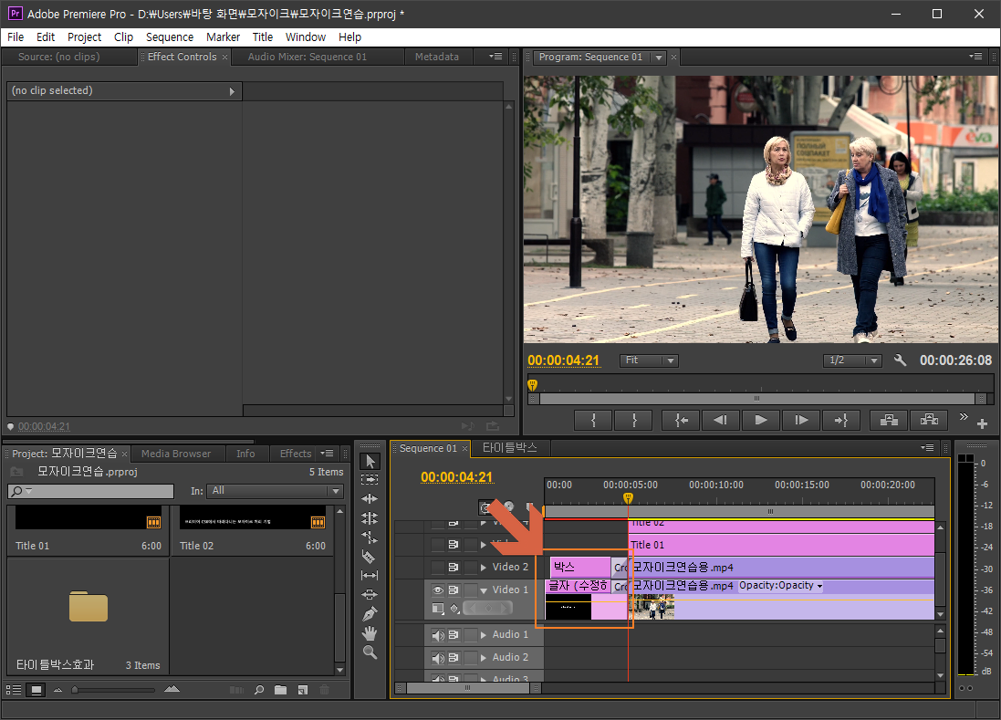 ① 타이틀박스 시퀀스에서 박스와 글자 타이틀 모두 선택 (단축키 Ctrl+A 또는 Shift + 마우스 클릭 또는 마우스 드래그)