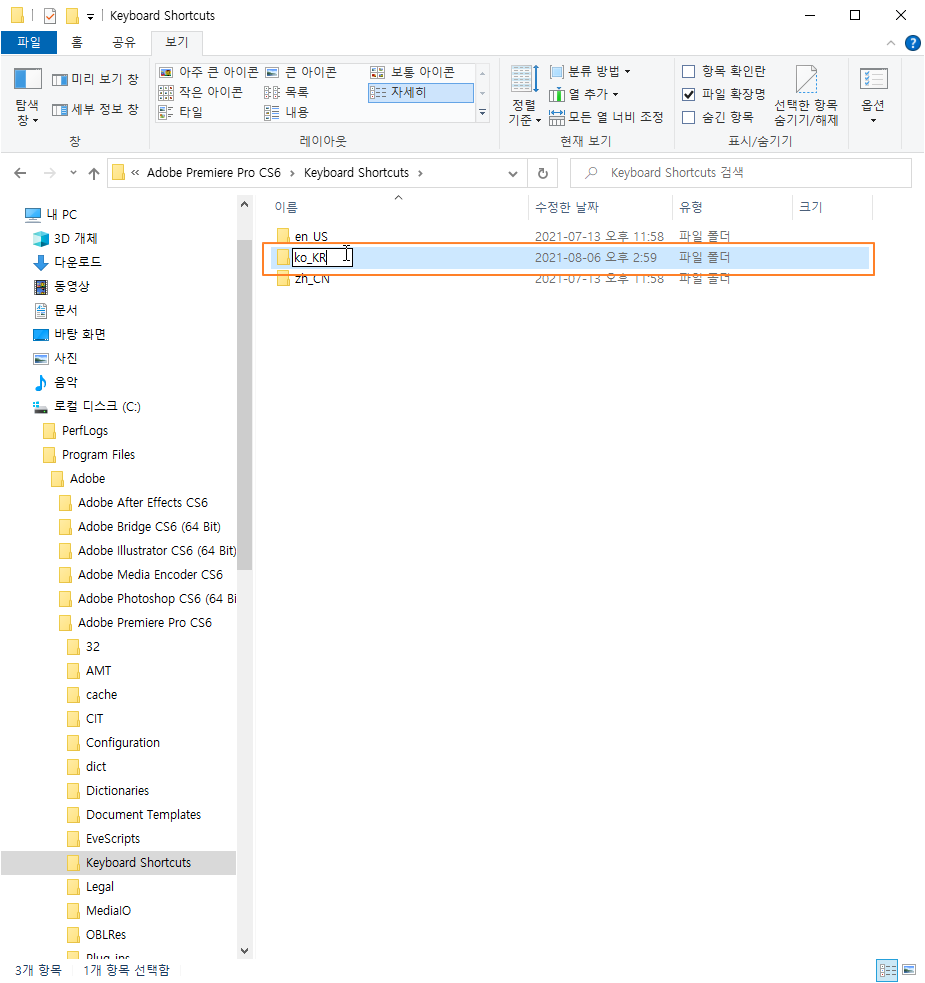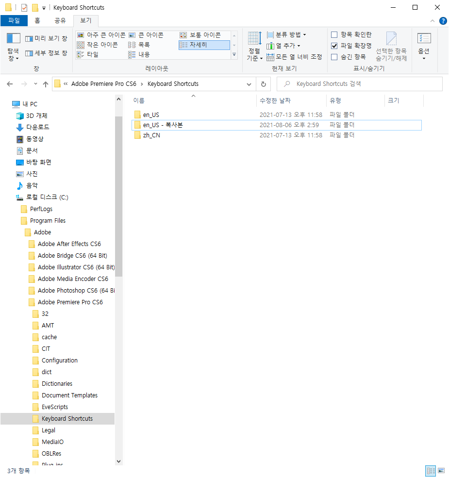 C:\Program Files\Adobe\Adobe Premiere Pro CS6\Keyboard Shortcuts 폴더로 이동한 후