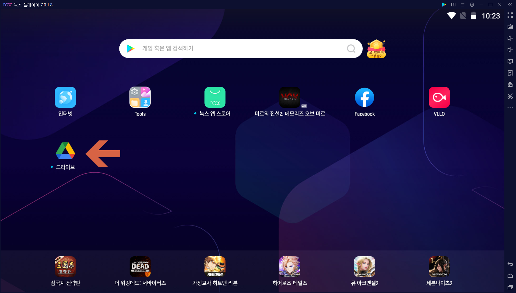Nox 플레이어 화면 위 검색창에 '구글 드라이브'를 입력하고 '엔터' 키 또는 검색 버튼(돋보기)을 눌러 주세요.