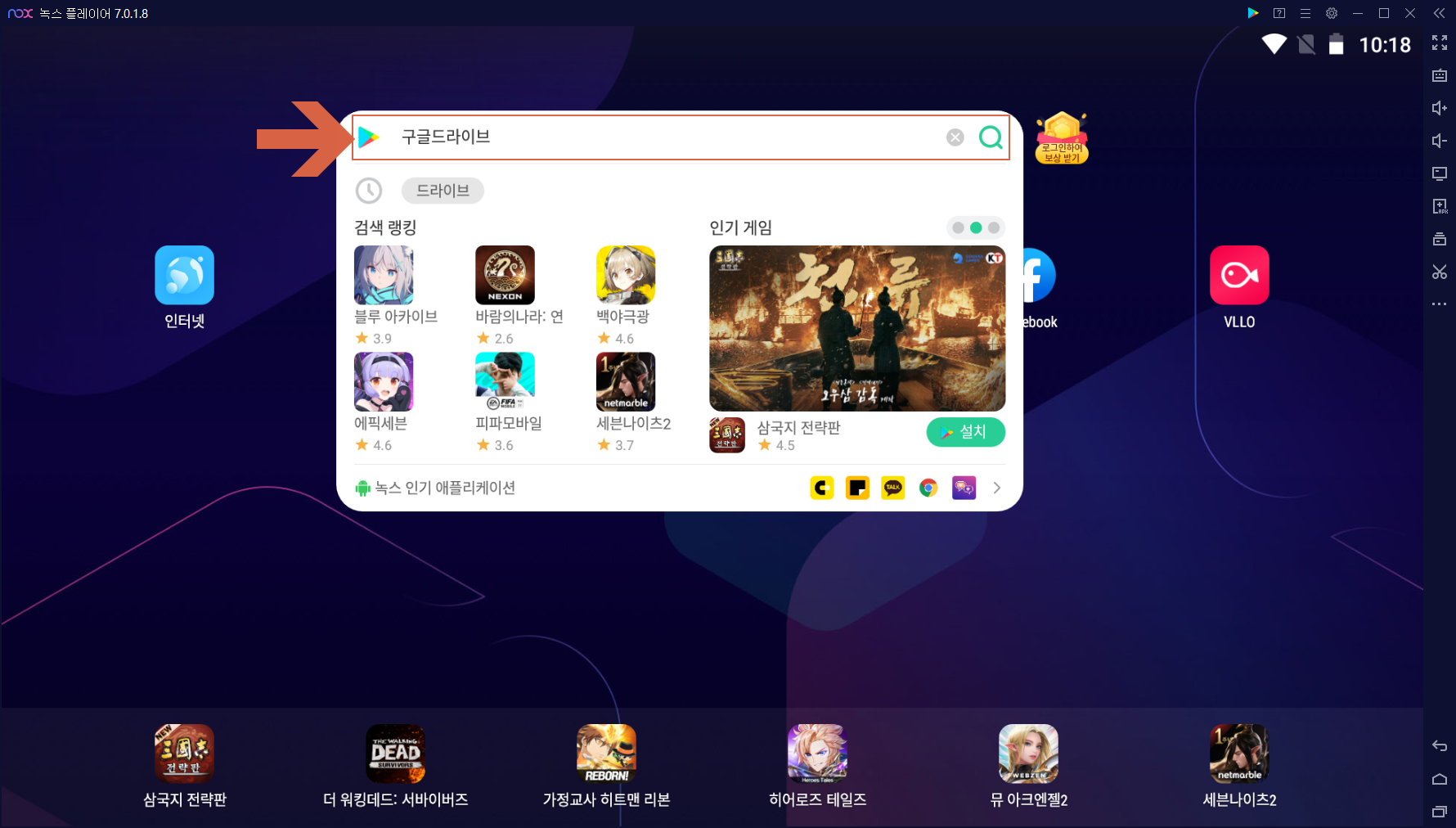 Nox 플레이어 화면 위 검색창에 '구글 드라이브'를 입력하고 '엔터' 키 또는 검색 버튼(돋보기)을 눌러 주세요.