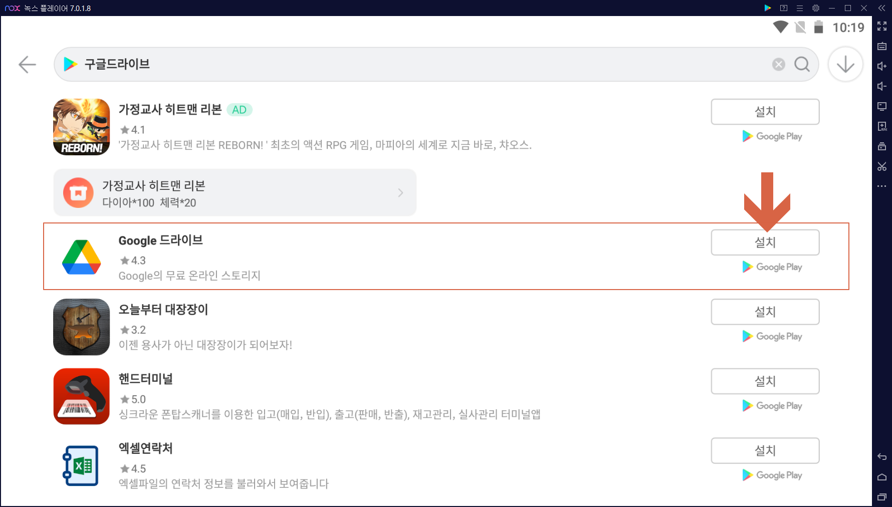 검색 결과에서 Google 드라이브 항목의 [ 설치 ] 버튼을 눌러 주세요