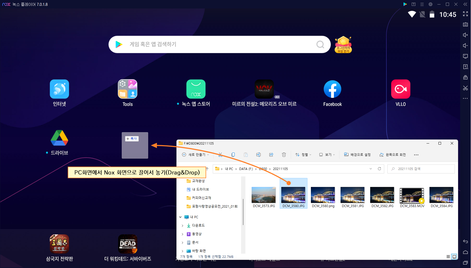 정말 쉽습니다. PC 화면에서 Nox 화면으로 파일을 끌어다 놓으면 복사됩니다.
