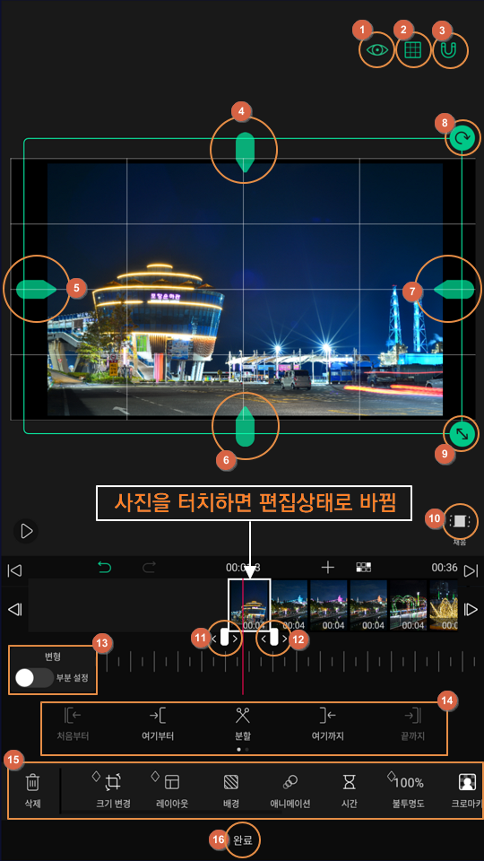 (1) 비디오 클립만 보고 싶을 때 (2) 편집화면 선(GRID) 표시 (3) 자석기능 (타임라인에서 적용) (4) 사진/영상 자르기 (위) (5) 사진/영상 자르기 (왼쪽) (6) 사진/영상 자르기 (아래) (7) 사진/영상 자르기 (오른쪽) (8) 사진/영상 회전 (9) 사진/영상 크기 변경 (10) 사진/영상 크기 적용방법 변경 (채움, 끼움, 가운데) (11) 사진/영상 재생시간 조절 (앞부분) (12) 사진/영상 재생시간 조절 (뒷부분) (13) 선택한 사진/영상의 부분 변경 설정 (키프레임 적용하여 모션제어 할 수 있음 / 크기, 위치, 회전, 반전, 크롭 등) (14) 사진/영상 편집 기능 (시작위치/끝위치/분할/맨앞으로/앞으로/뒤로/맨뒤로 이동기능) (15) 사진/영상 편집 기능 (삭제, 모션제어, 화면분할, 페이드인/아웃, 재생시간/속도 조절, 투명도 조절, 크로마키, 블러, 보정, 필터, 복제, 교체 등) |