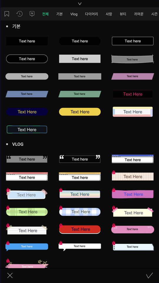영상을 꾸밀 수 있는 아기자기하고 예쁜 스티커도 무료로 제공하고 있으며, 모든 스티커를 다 사용 하기 위해서는 프리미엄 회원으로 등록해야 됩니다.