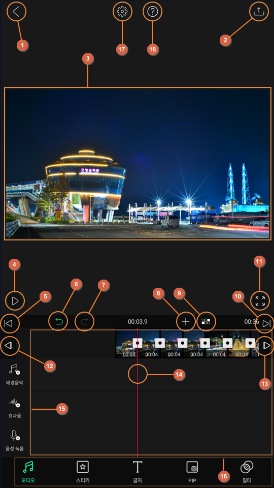 (1) 프로젝트에서 빠져 나가기 (첫 화면으로 이동) (2) 영상 추출 버튼 (인코딩) (3) 미리보기 및 편집 창 (4) 재생버튼 (5) 처음으로 이동 (길게 누름) (6) 작업 이전으로 되돌림 (7) 작업 앞으로 돌아가기 (되돌림 취소) (8) 소스 추가 버튼 (9) 소스 재배치 (10) 뒤로 이동 (길게 누름) (11) 미리보기 최대화면으로 변경 (12) 한프레임씩 뒤로 이동 (13) 한프레임씩 앞으로 이동 (14) 타임인디게이터 (편집 지점/재생시작 지점/고정되어 있음) (15) 타임라인 (사진/영상, 배경음악, 효과음, 음성녹음, 모션스티커, 프레임, 템플릿, 글자, 라벨, 자막, 이미지, GIF, 비디오, 필터, 보정, 모자이크) (16) 기본 지원기능 (오디오/스티커/글자/PIP/필터) (17) 영상규격 설정 버튼 (18) 사용방법 영상 설명 |