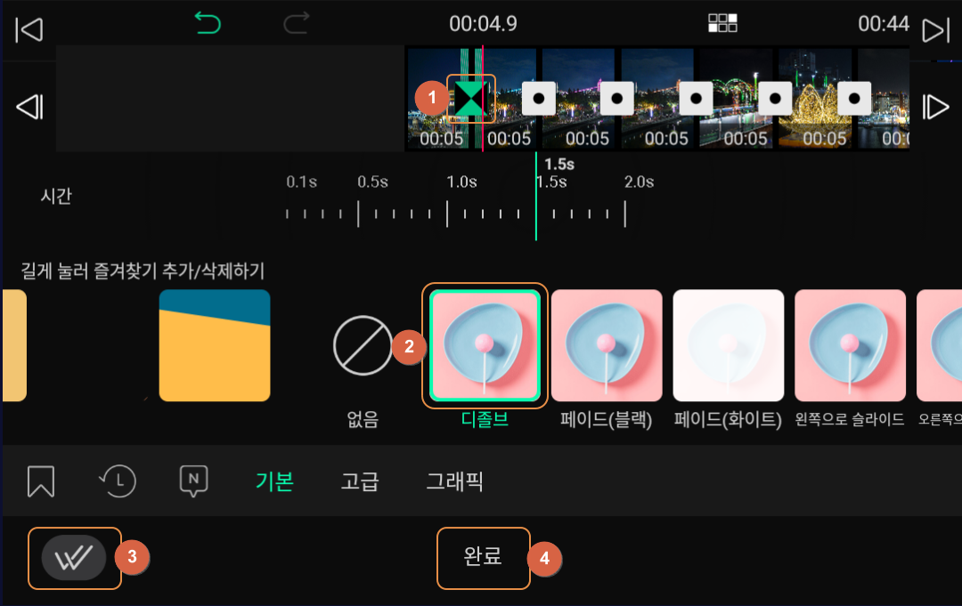 ① 번 부분을 터치한 후 ② 번 부분에서 '디졸브'를 선택해 보세요.