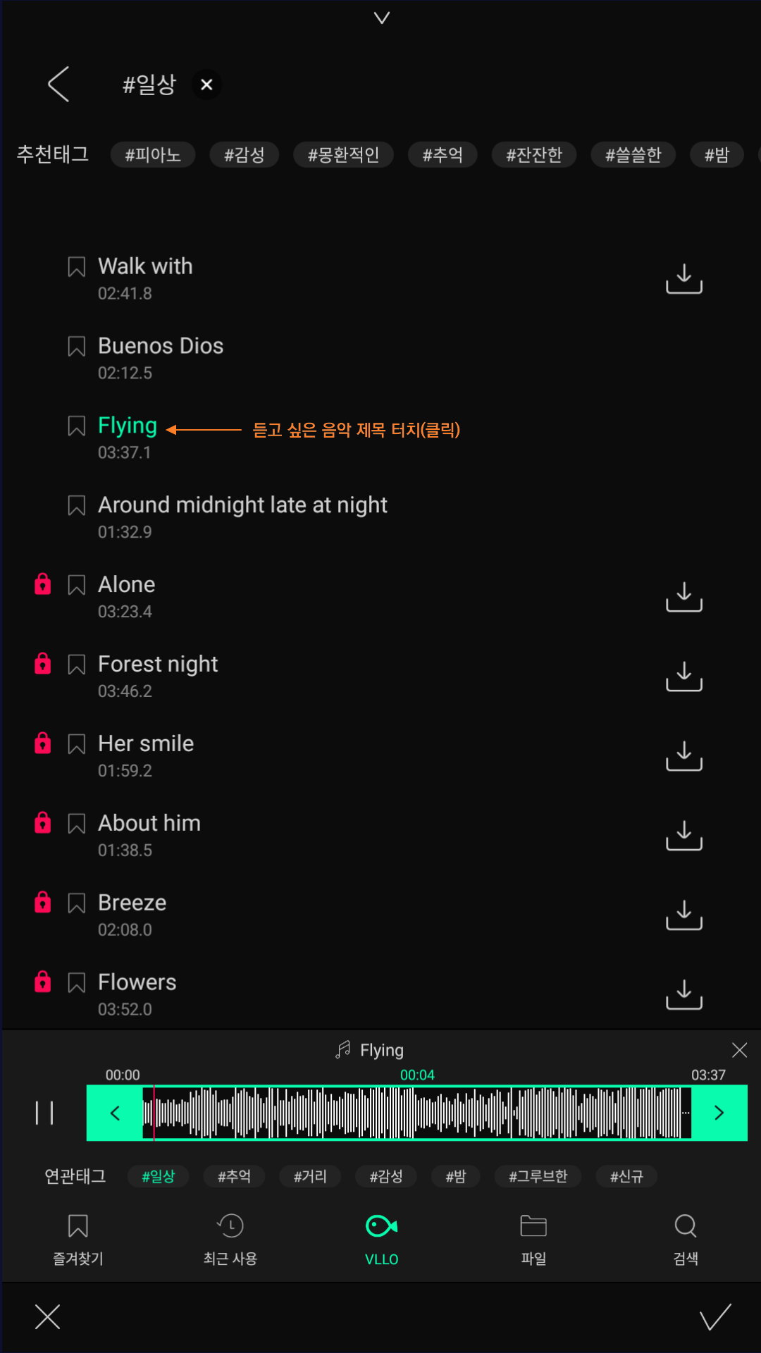VLLO에서 제공되는 음악은 유튜브 영상용으로 사용해도 되는 무료 음악입니다. 기본 제공 음악으로도 충분히 활용할 수 있지만, 유료 결제를 하면 더욱 다양한 음악을 사용할 수 있습니다.