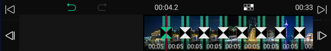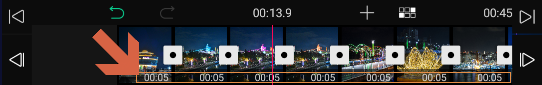 사진과 사진 사이의 점이 있는 사각형이 장면 전환 효과를 적용할 수 있는 부분입니다.
