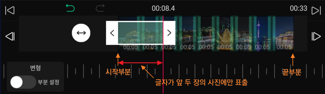 | 처음부터 | 글자가 영상 처음부터 나오도록 설정 |