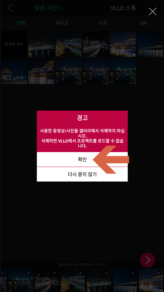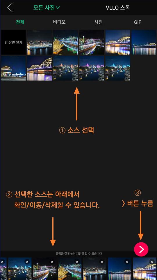 | 아래 선택된 사진을 길게 누르면 순서를 변경할 수 있습니다. | VLLO에 사진을 추가해도 실제 사진은 갤러리에 그대로 있으므로 갤러리에서 사진을 삭제하게 되면 VLLO에 추가된 사진을 볼 수 없으니 주의하세요. |
