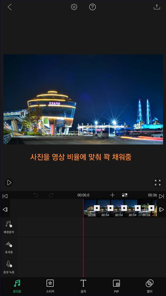 VLLO앱에서 사진의 기본 재생시간은 4초입니다. 배경음악을 넣게 되면 4초라는 시간이 의외로 짧다라는 느낌이 들 수 있는데요, 사진을 터치하여 재생시간을 5초로 늘려 보세요.