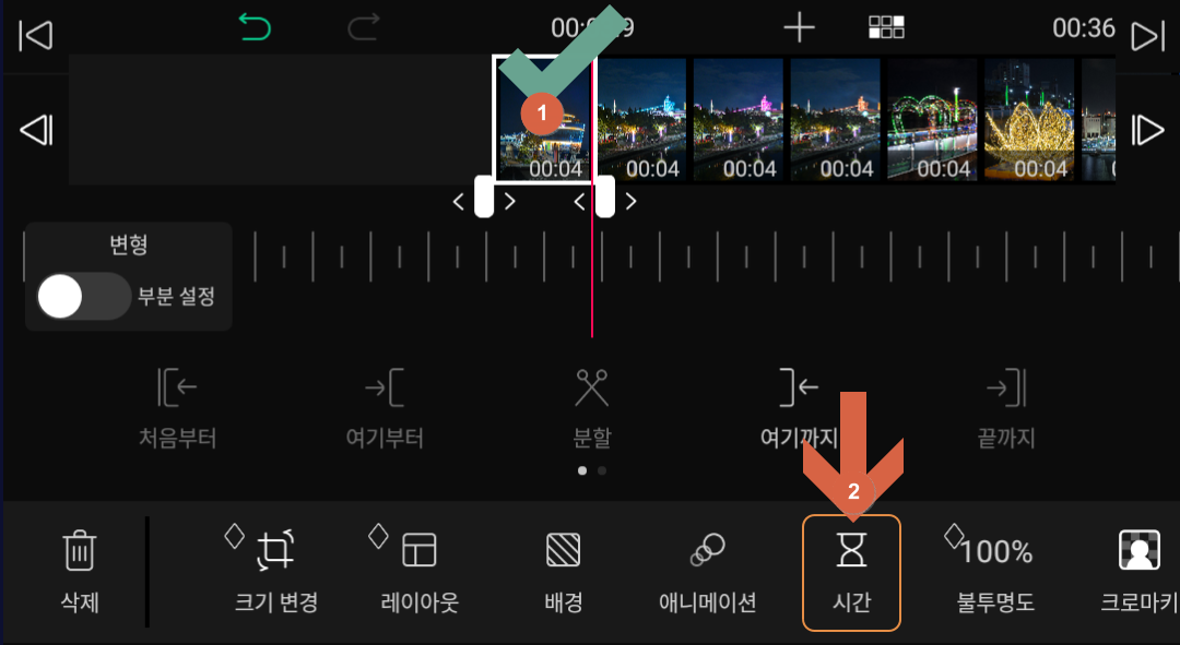① 첫 번째 사진을 터치한 후 ② [ 시간 ] 부분을 터치합니다.