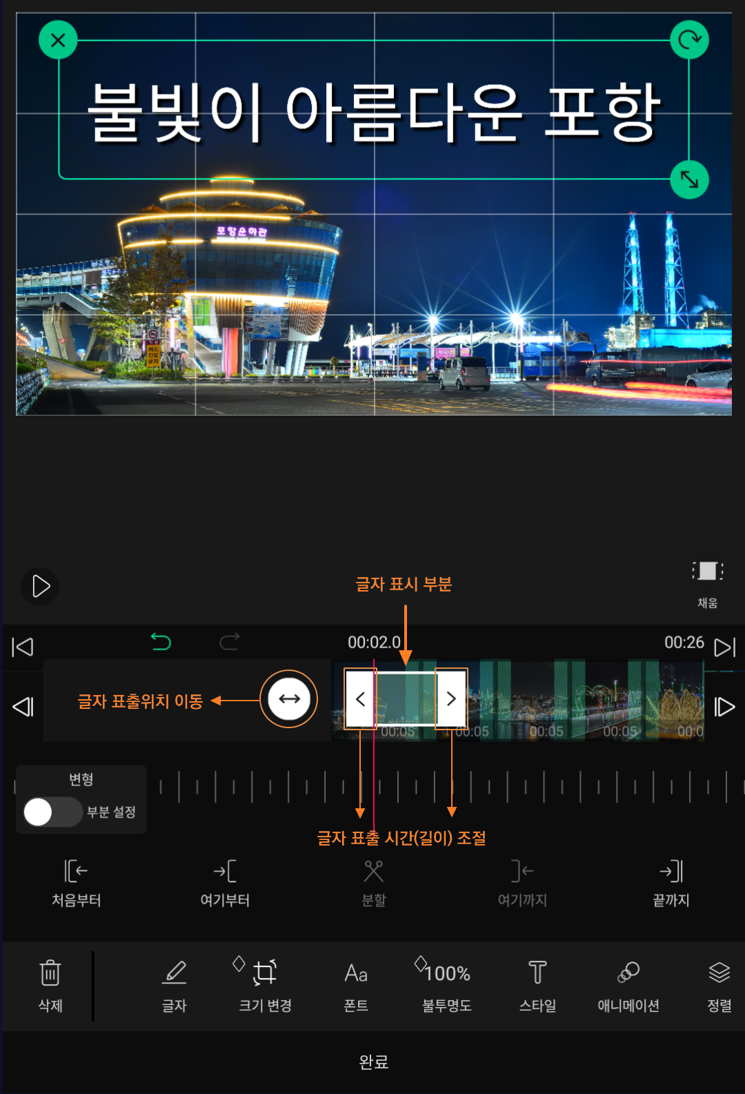 글자 입력 후 완료 버튼을 눌렀다면 아래와 같이 글자 트랙에서 글자를 다시 눌러 주세요.