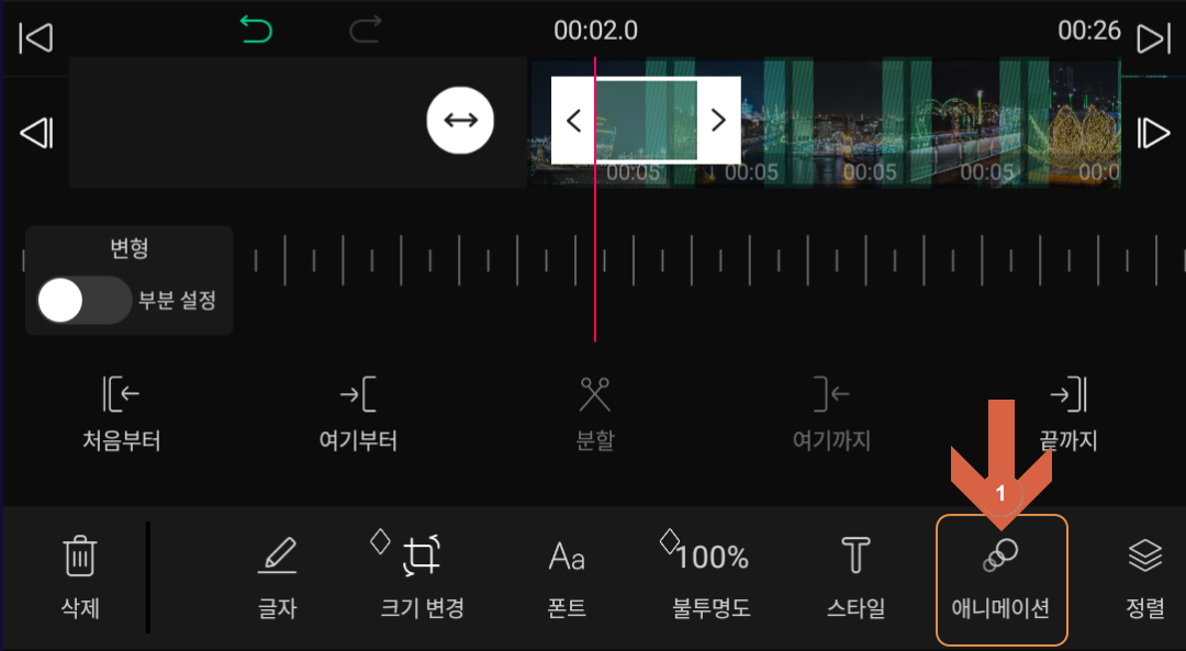 ① 글자 입력/편집 화면에서 아래 '애니메이션'을 누릅니다.
