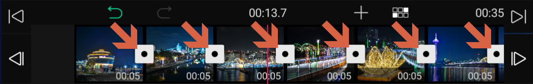 사진과 사진 사이에 보이는 검은 점이 있는 사각 도형이 장면 전환 효과 설정 부분입니다.