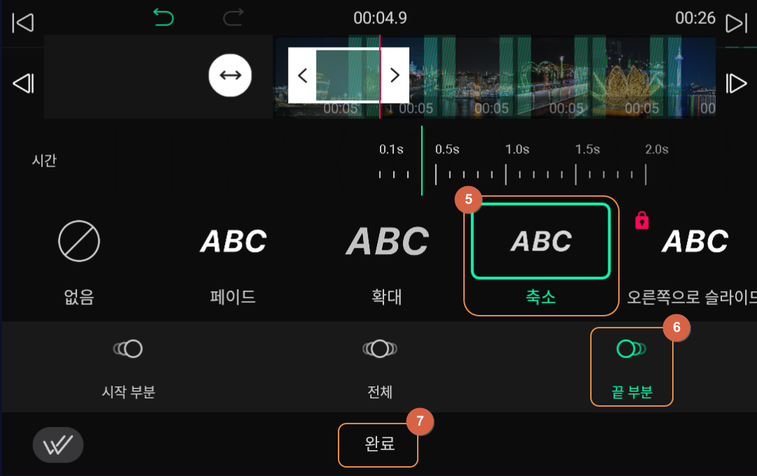 ① 첫 번째 사진 선택 | ② 시간 눈금자 조절해서 5.0s로 맞춤 |