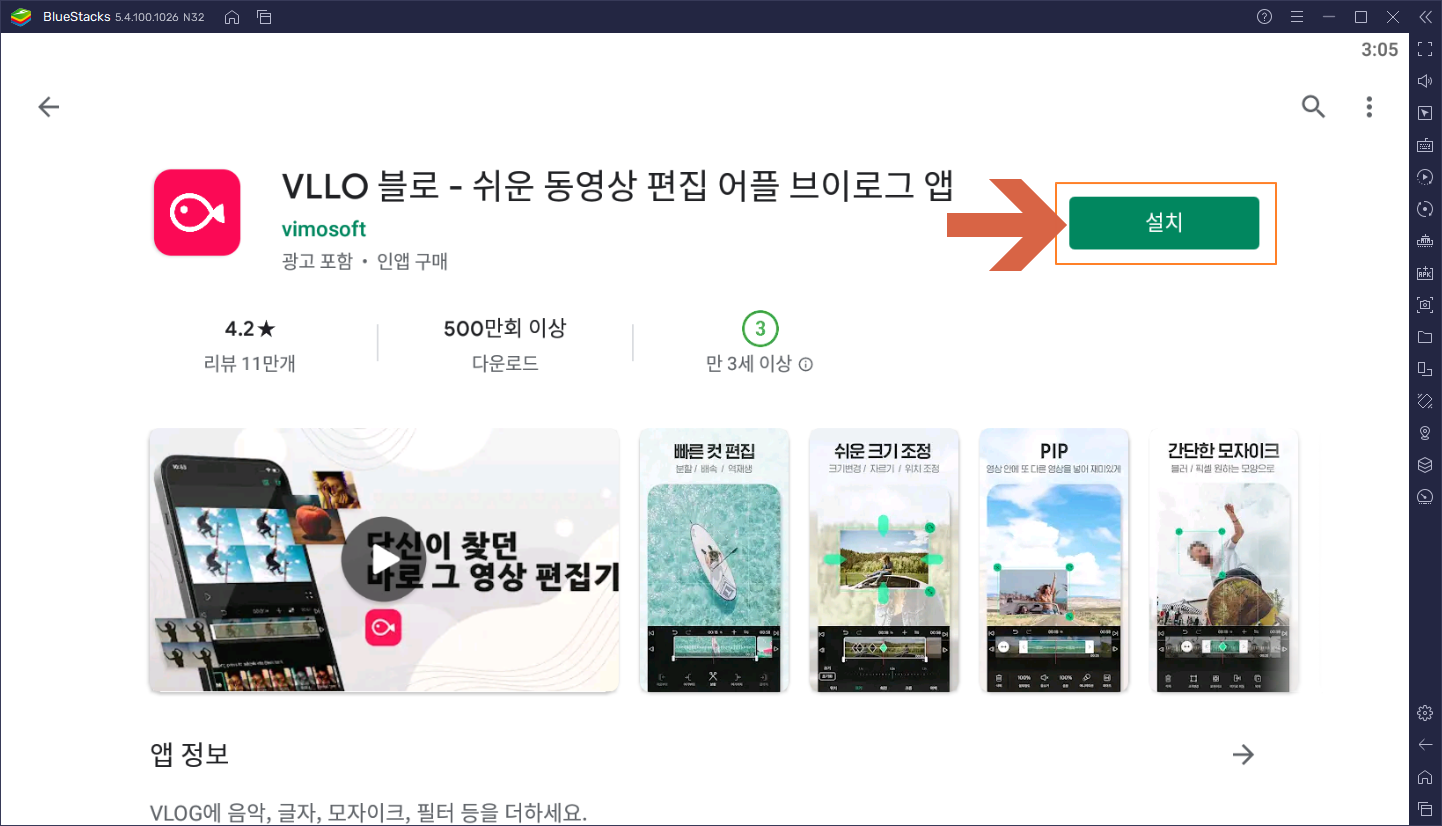 아래와 같이 블로(VLLO) 앱이 검색되었으며 [설치] 버튼을 눌러서 설치합니다.