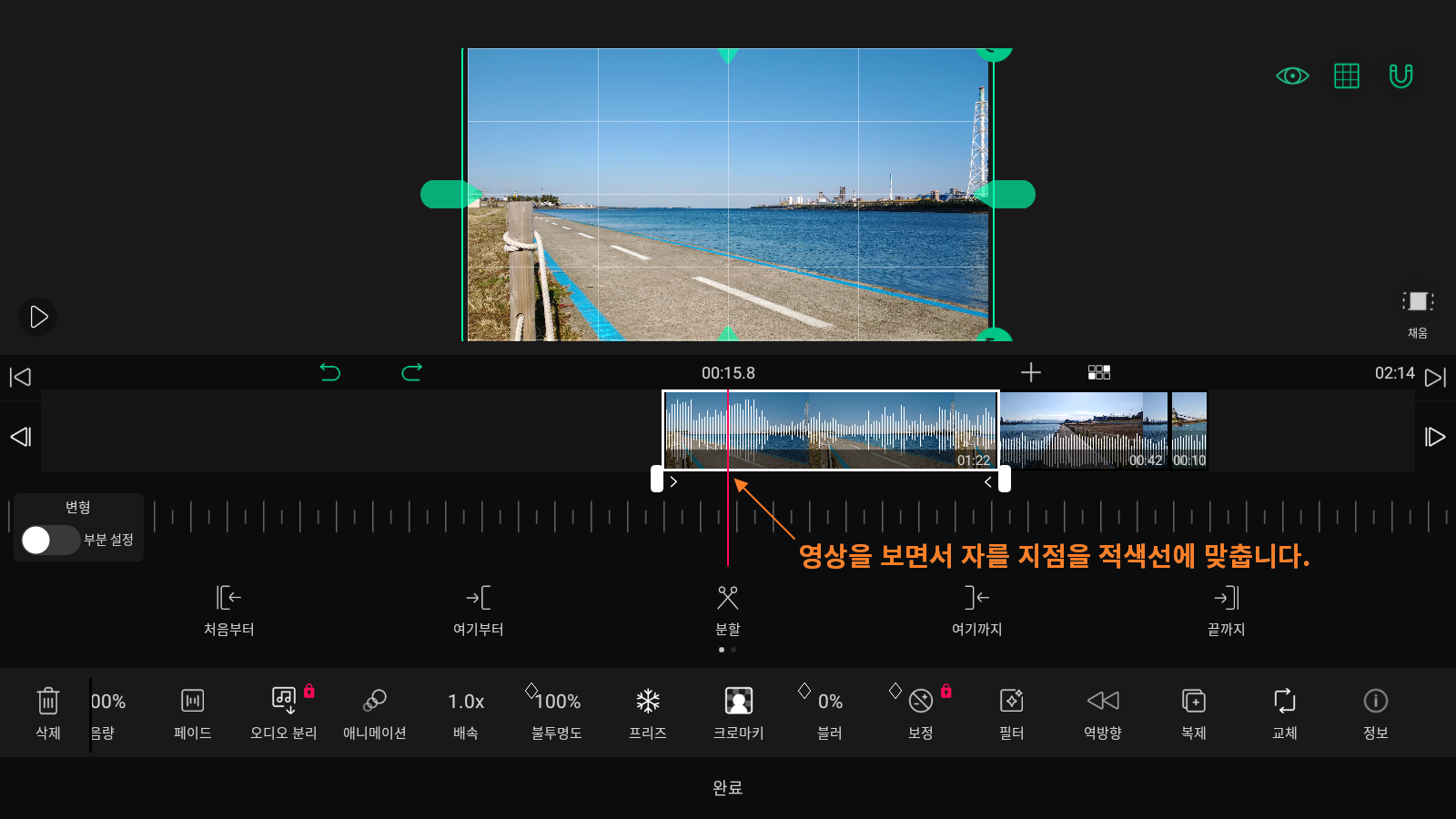 화면 아래의 [완료] 버튼을 눌러 컷 편집 작업을 마칩니다.
