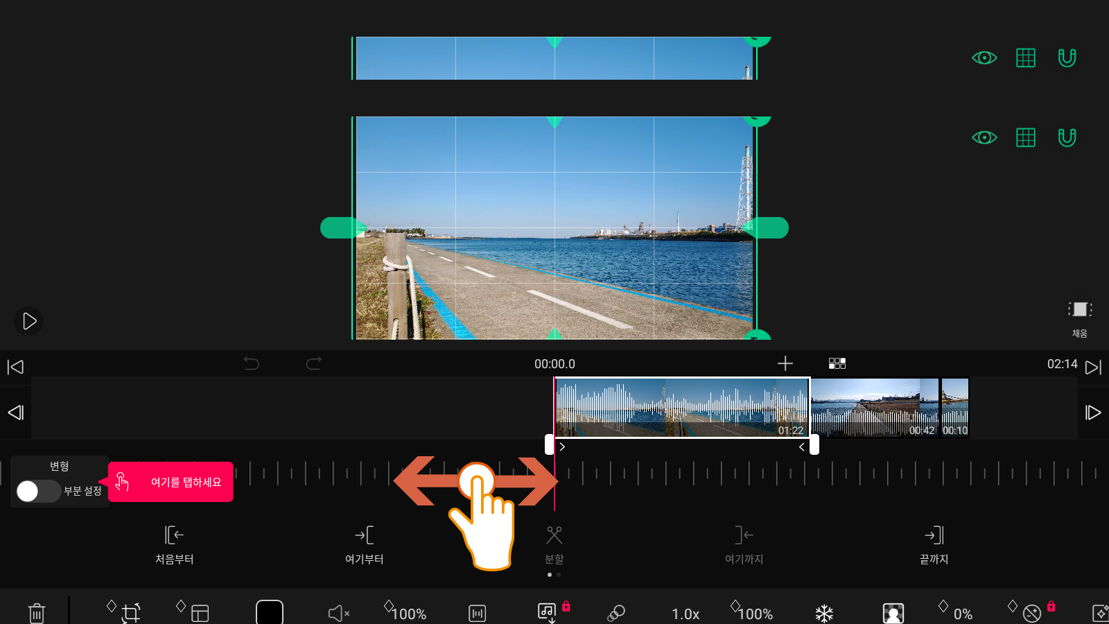 분할한 클립 중 앞부분을 삭제하고자 할 때, 적색선 부분에 삭제할 클립이 오도록 타임라인을 이동하거나, 삭제할 클립을 터치하여 선택한 후 [삭제] 버튼을 누릅니다.