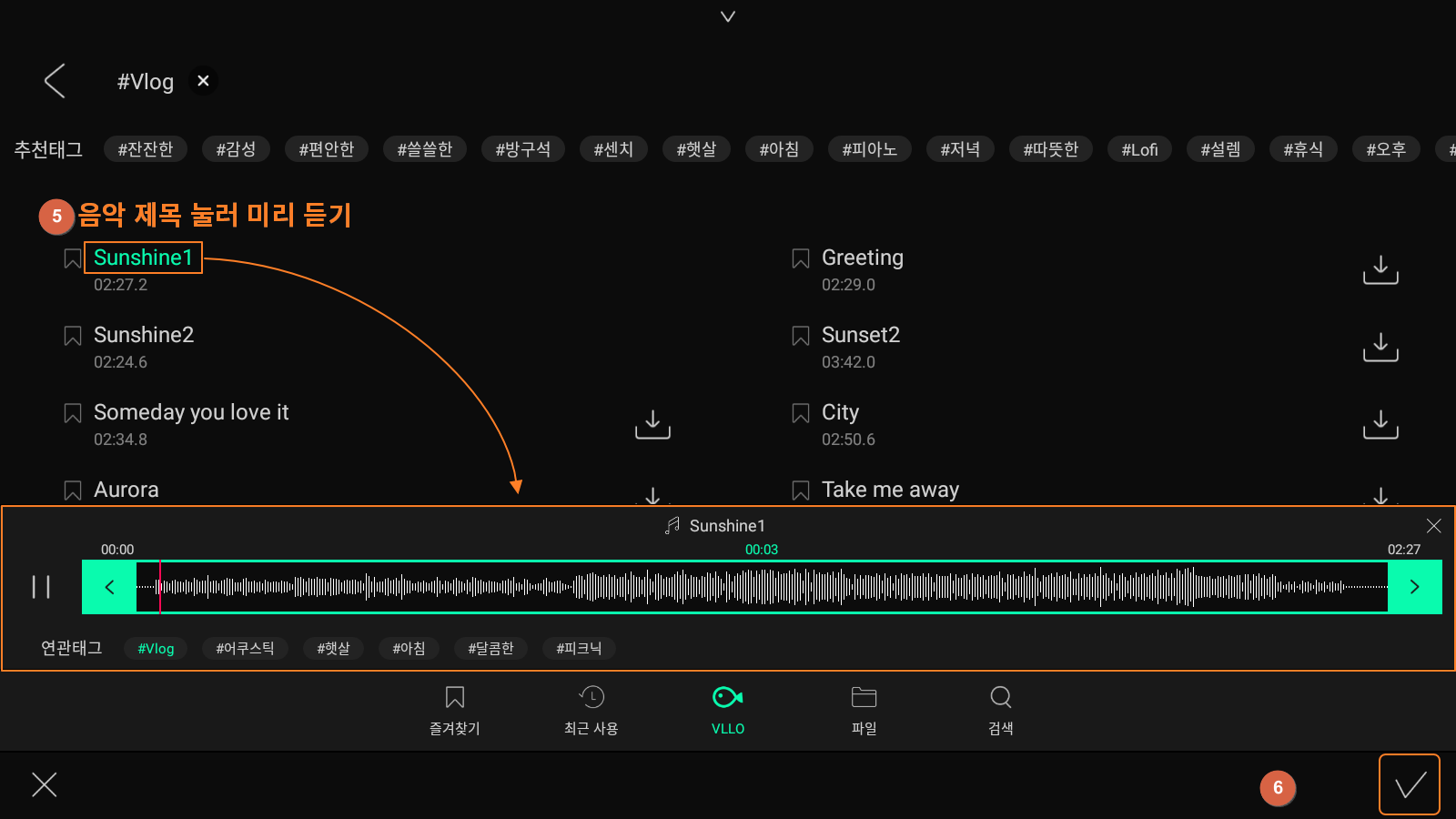 블로(VLLO) 앱에서는 저작권을 표시하지 않고 사용할 수 있는 무료 음악을 제공하고 있습니다.