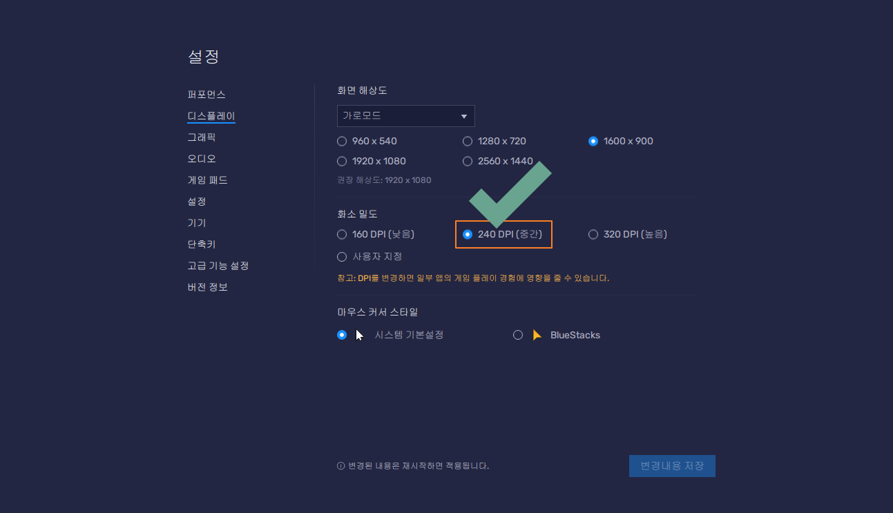 ② 디스플레이 항목에서 화소 밀도를 240 DPI(중간)으로 설정합니다.