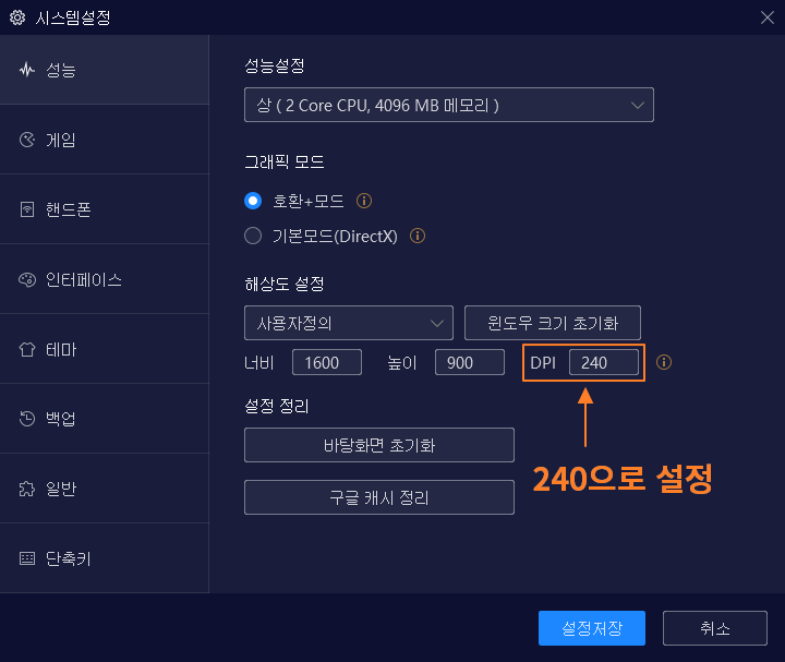 ② 해상도 설정에서 DPI를 240으로 설정