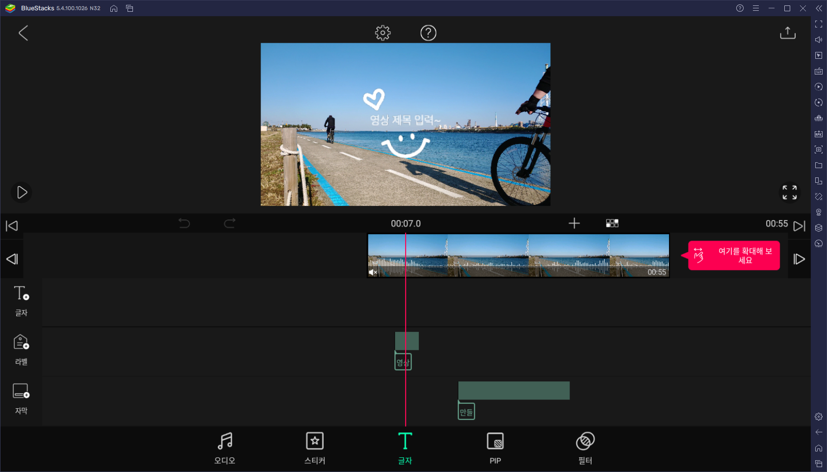 ③ 아래와 같이 안드로이드 에뮬레이터인 블루스택(BlueStacks)에서 블로(VLLO) 앱이 가로모드로 실행되었습니다.