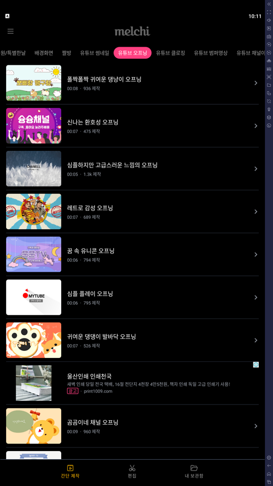 | 유튜브 오프닝 | 영상 처음 시작할 때 보여주는 인트로 영상입니다. 잘 활용하면 영상의 수준이 확~ 올라갈 수 있습니다. |