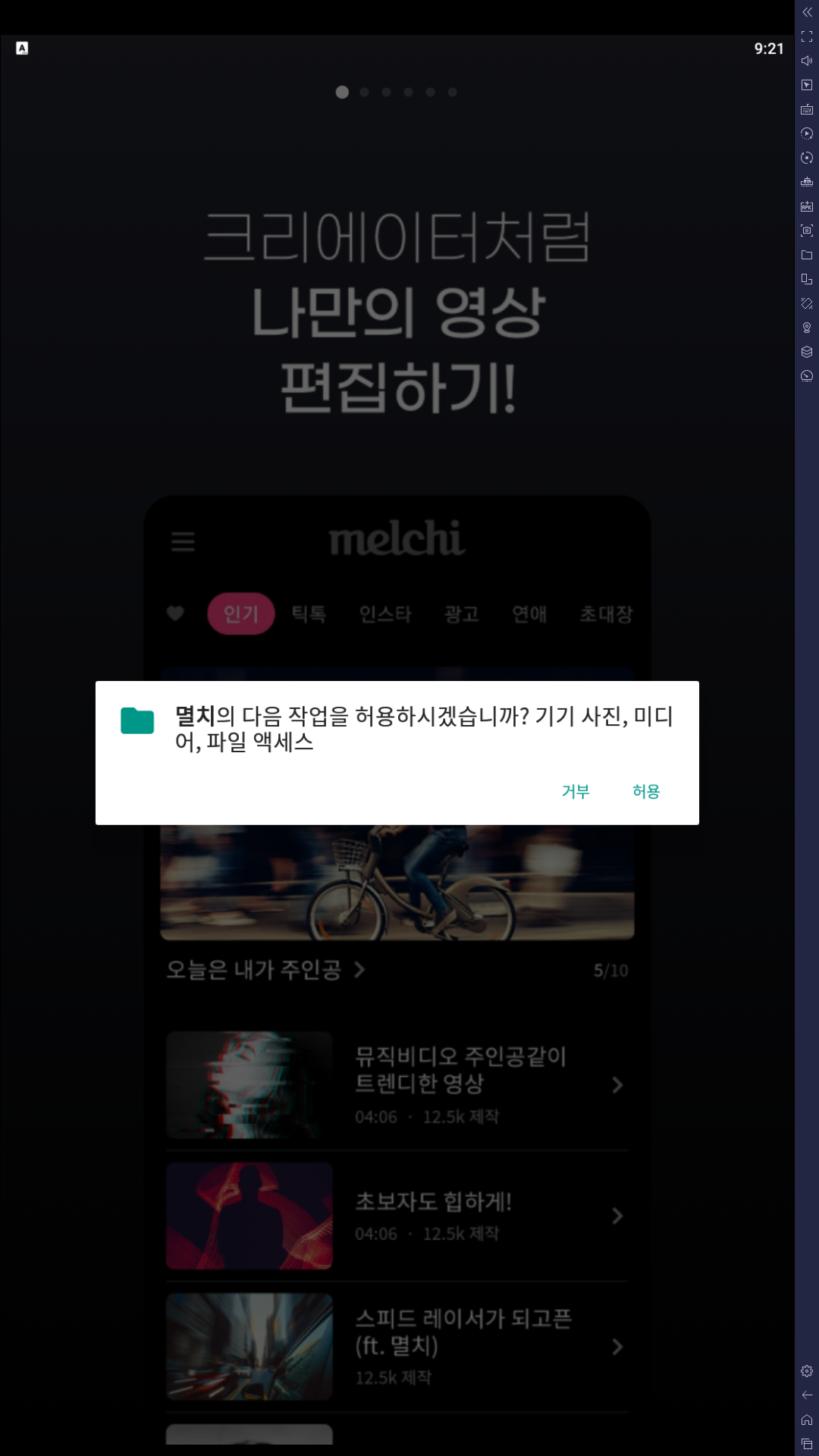처음 실행하면 멸치 앱에서 갤러리의 영상/사진 및 기타 파일을 저장할 수 있도록 폴더의 접근권한 요청을 하며, 모두 허용하면 됩니다.
