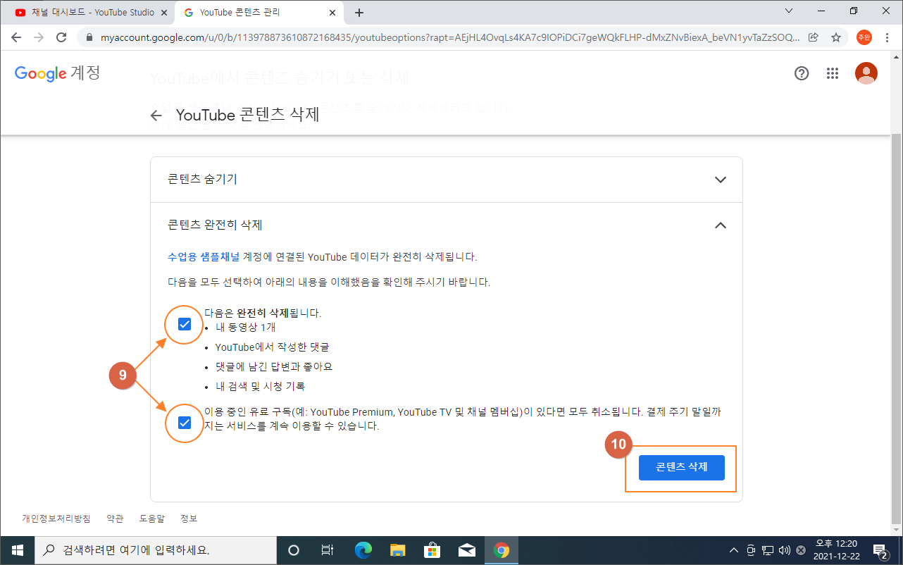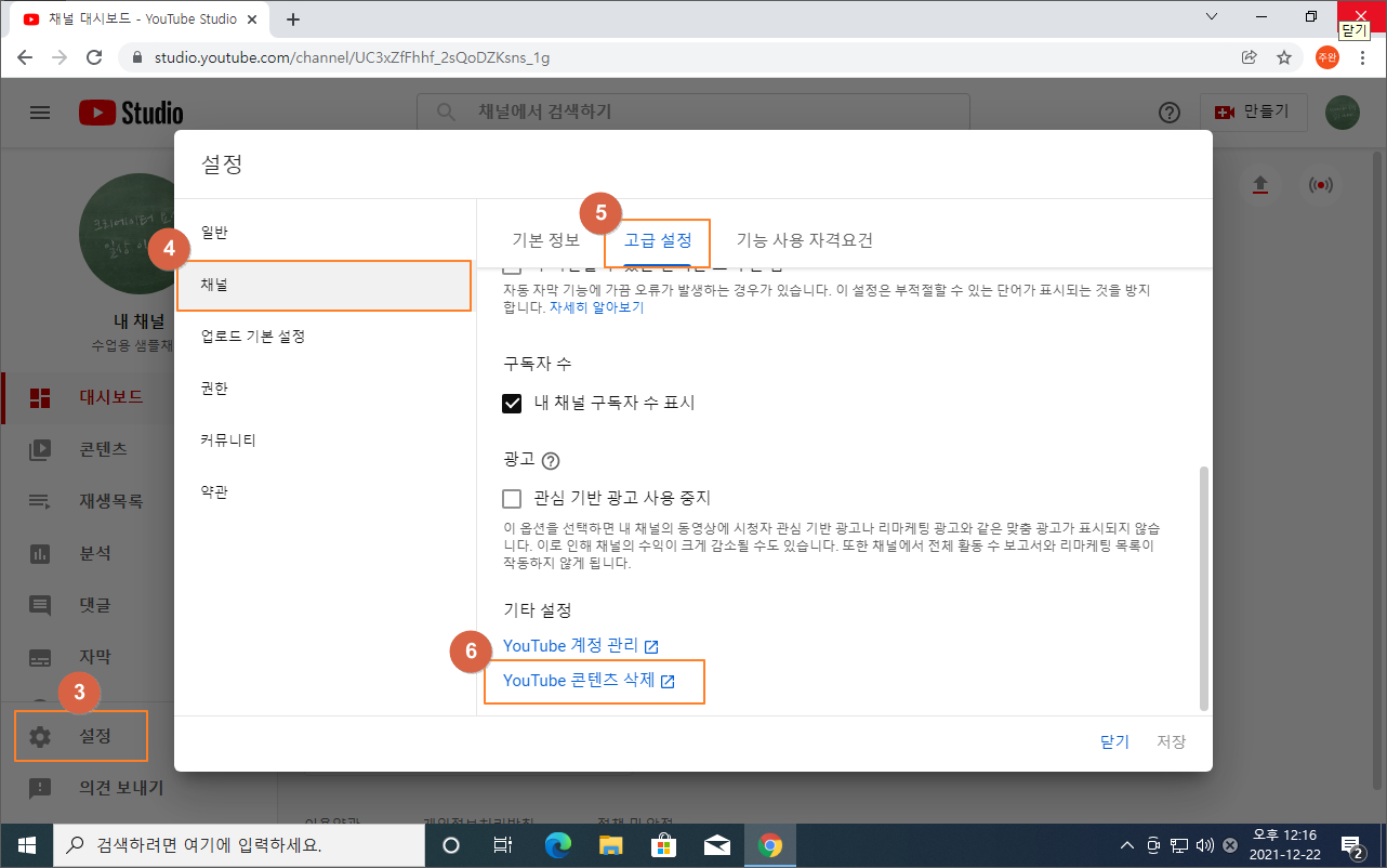 ⑥ YouTube 콘텐츠 삭제 클릭