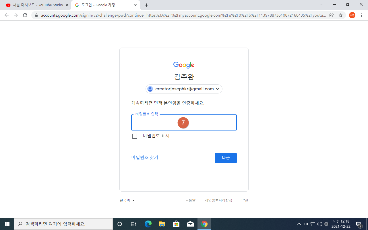 ⑦ 구글 계정 비밀번호 입력