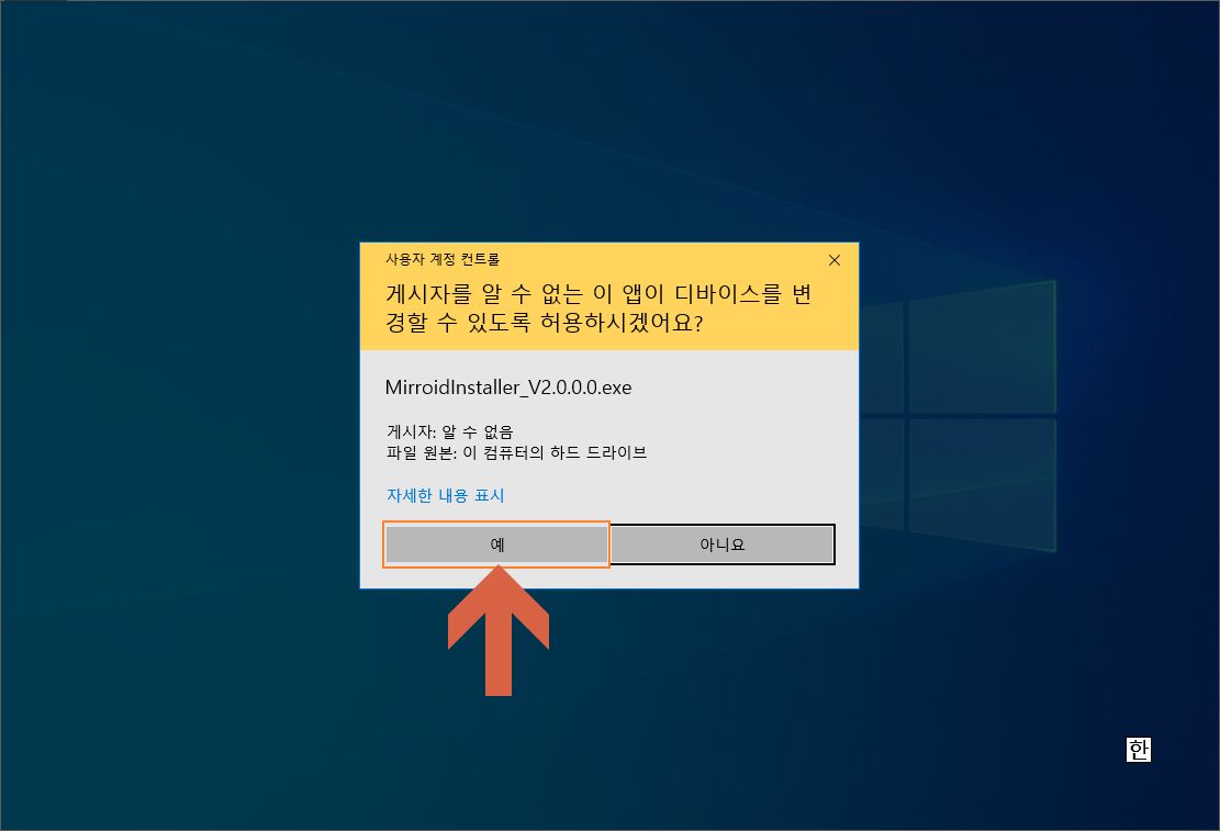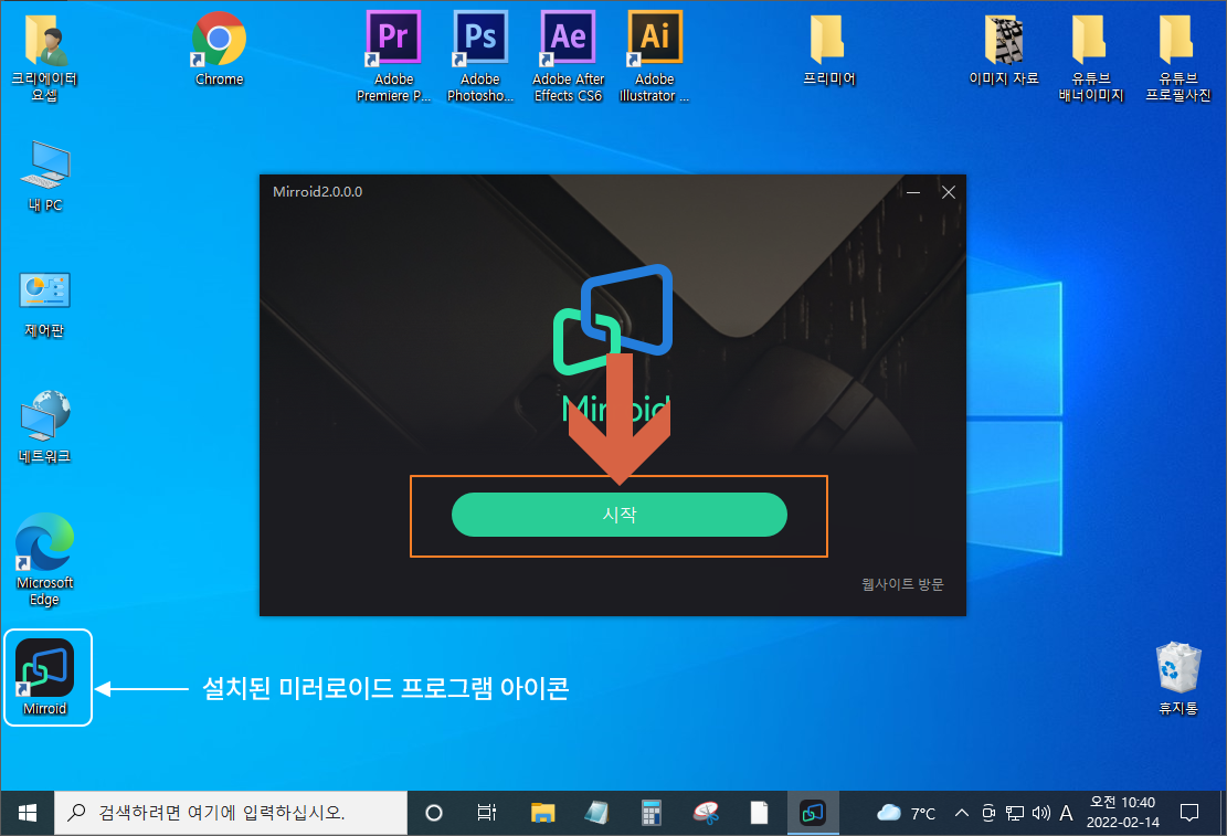 설치가 완료되었습니다. ( 시작 ) 버튼 클릭 또는 바탕화면의 미러로이드 앱 아이콘을 더블 클릭하여 실행하여 주세요.