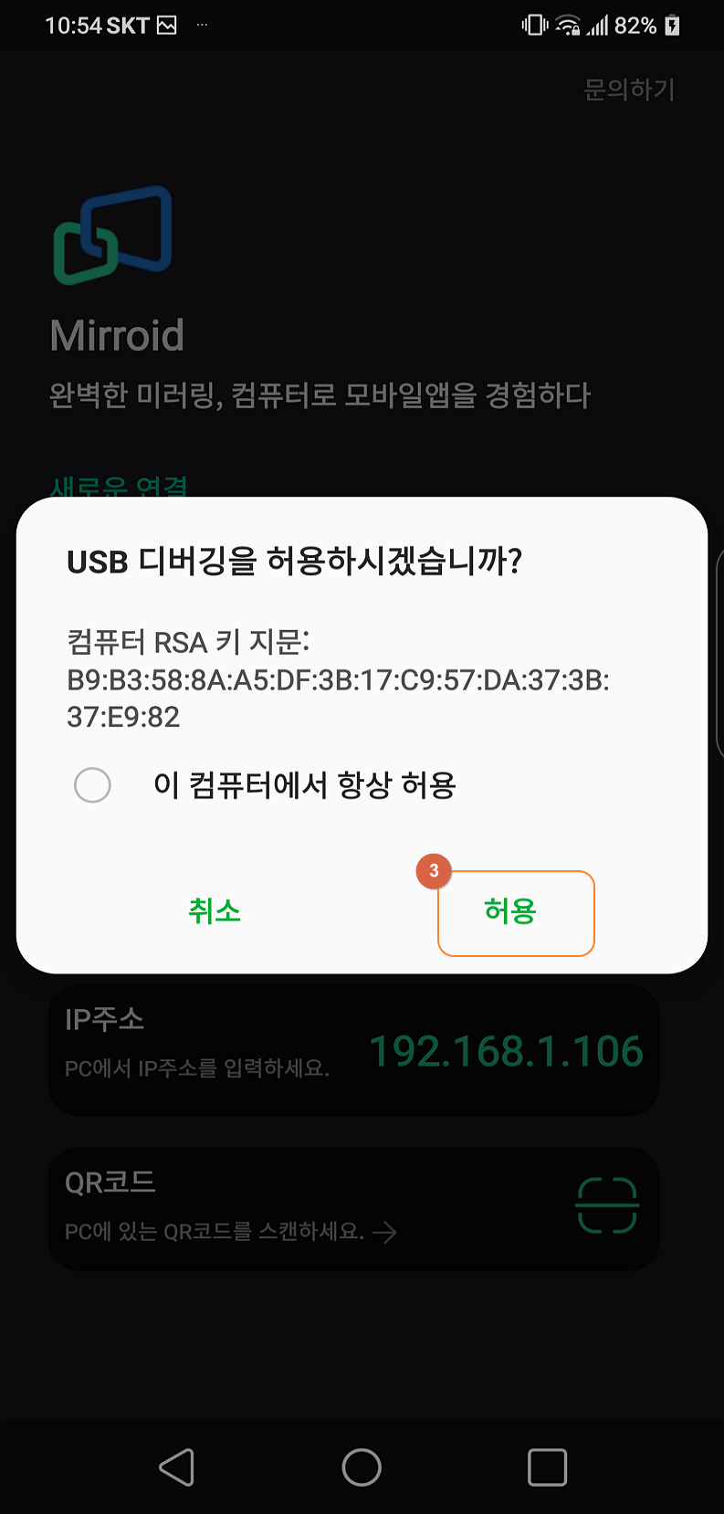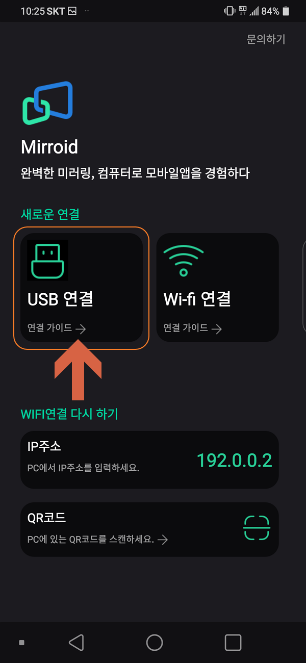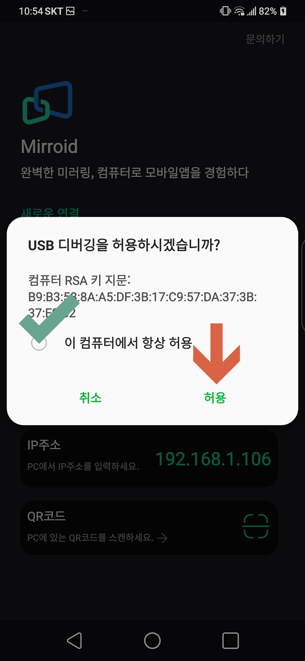 미러로이드는 wifi로도 연결하여 사용할 수 있으나 최초 1회는 USB 케이블로 연결한 후 PC의 미러로이드 앱에서 wifi 연결을 허용해 주어야 합니다.