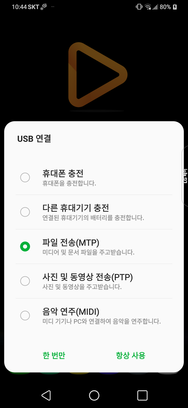 스마트폰을 PC에 연결하면 스마트폰 화면에 아래와 같이 USB 디버깅 허용 창이 떠야 정상적인 연결이 된 것입니다. 만약, 이 창이 안 뜬다면 스마트폰에서 USB 연결 모드를 변경해 보세요.