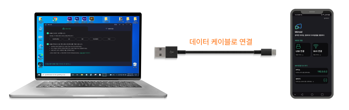 PC와 스마트폰 모두에서 미러로이드 앱이 실행되어 있는 상태에서 데이터 케이블로 스마트폰과 PC를 연결합니다.