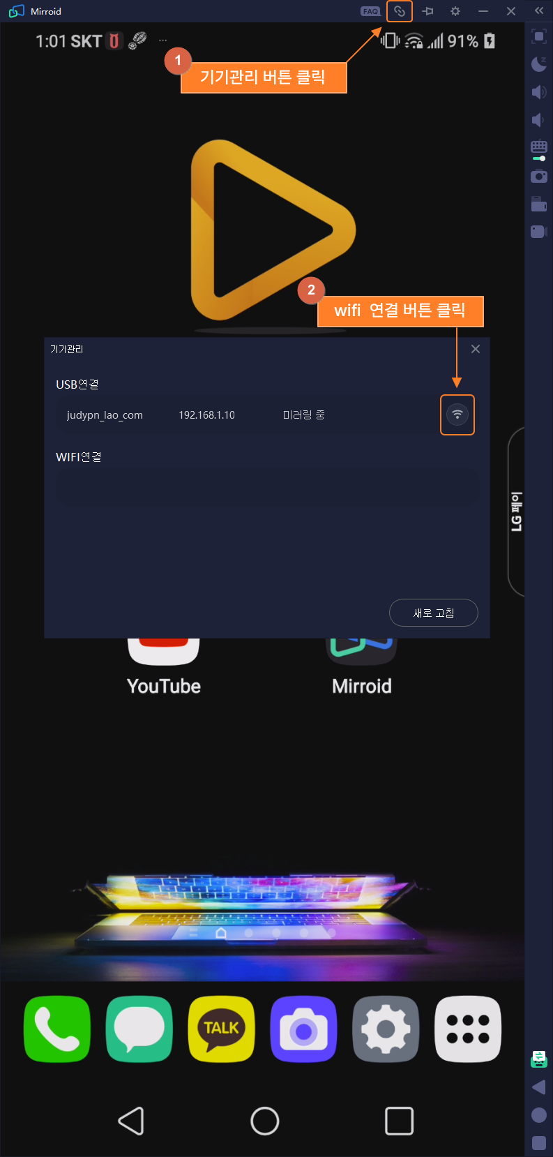 ① PC의 미러로이드에서 '기기관리' 버튼 클릭