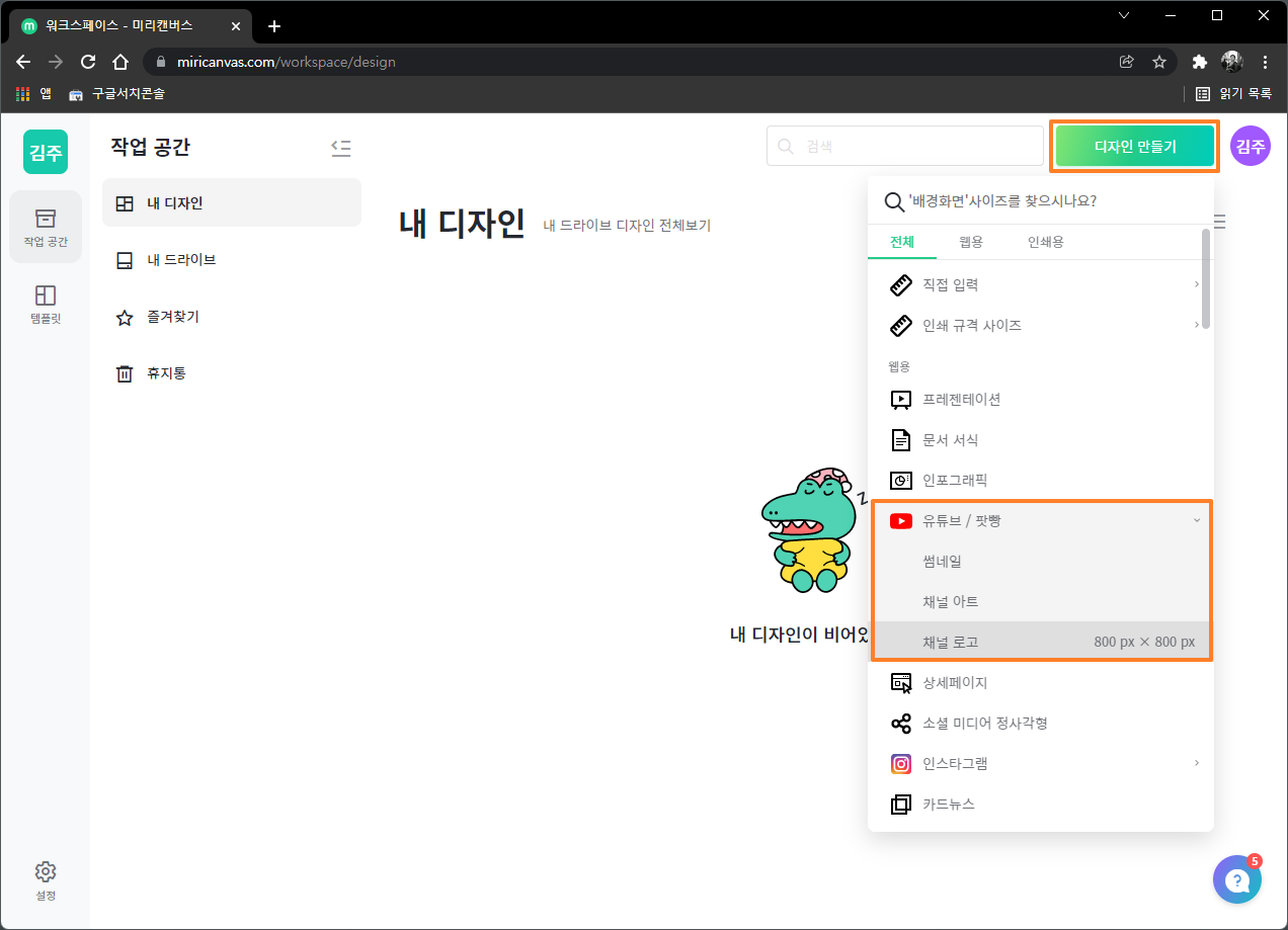 회원 가입하면 작업 공간이 주어지며, [디자인 만들기] 버튼을 누르면 다양한 형식의 템플릿을 선택해서 사용할 수 있습니다.