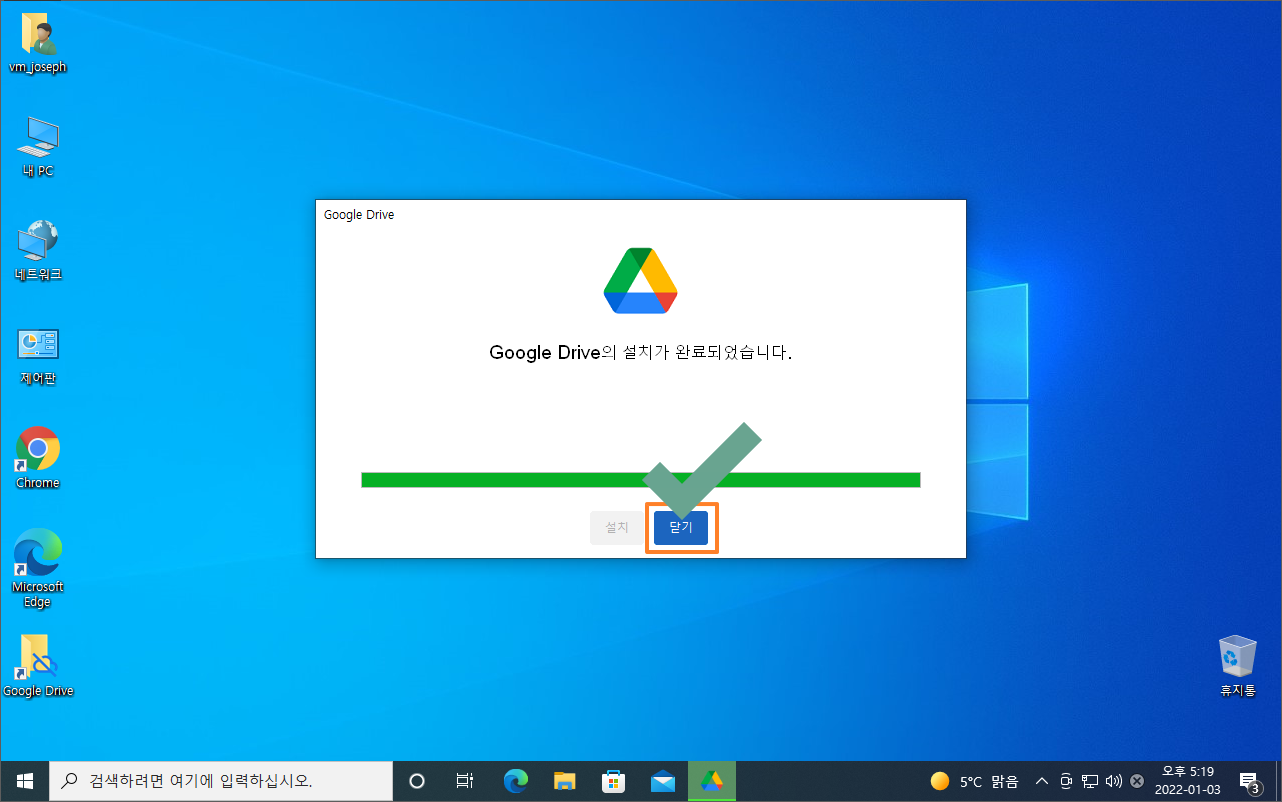 구글 드라이브 설치가 완료되었습니다는 창이 뜨면 [ 닫기 ] 버튼을 누르면 됩니다.