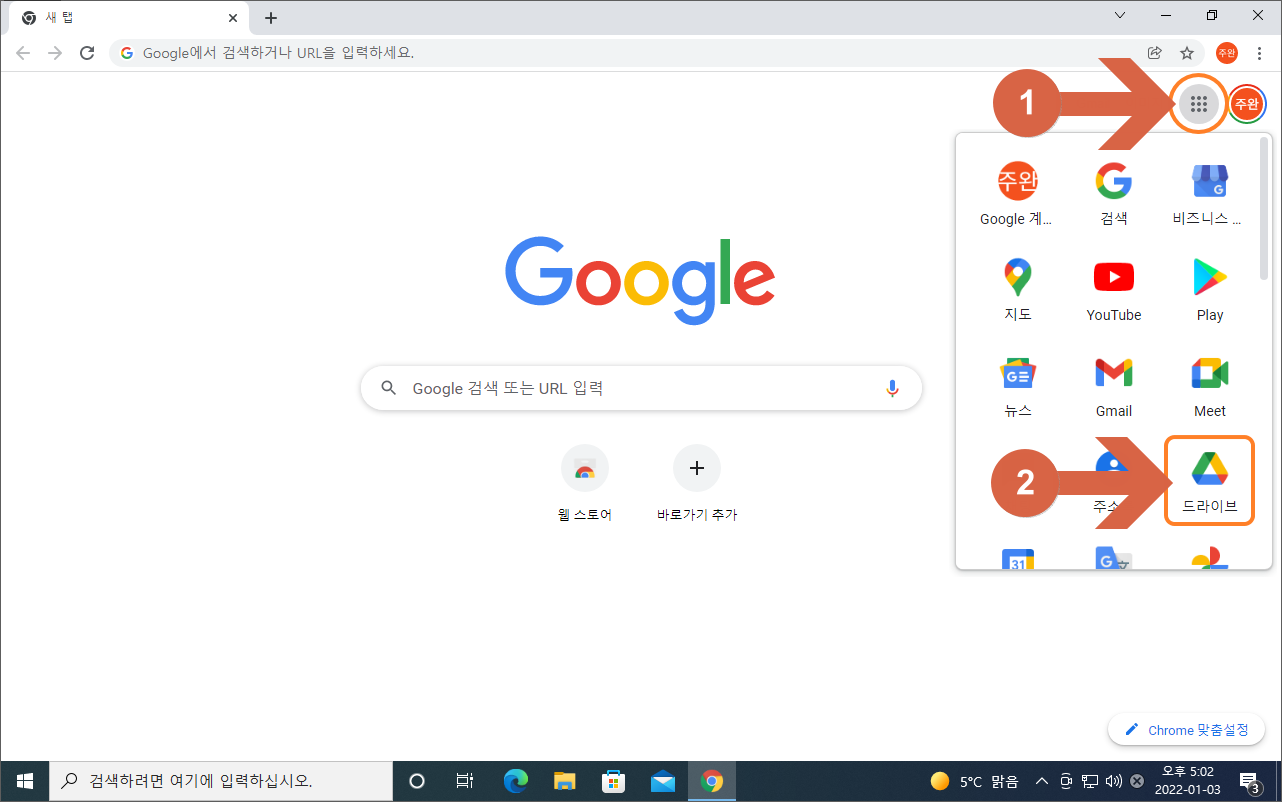 구글 계정으로 로그인된 상태에서 진행한 예시이므로 로그인이 안되어 있다면 ②드라이브 앱을 선택 후 로그인하여 주세요.
